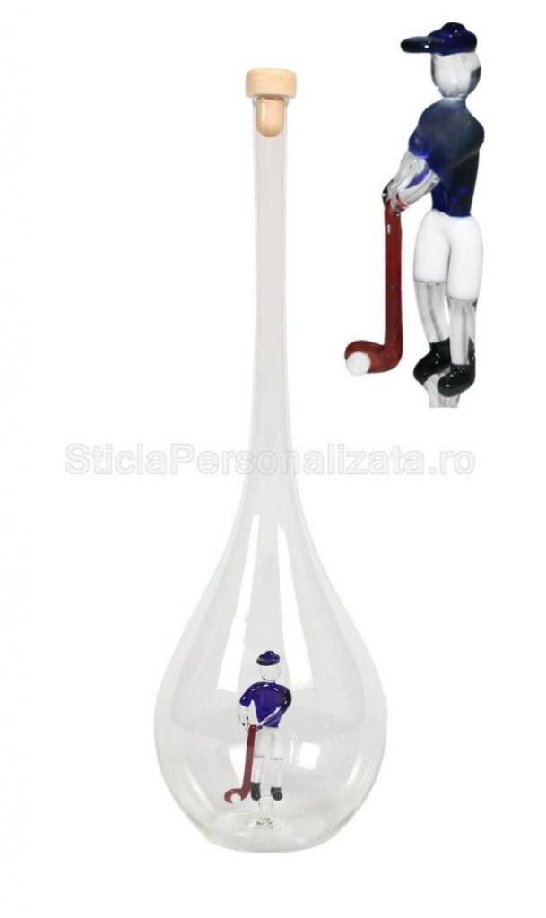 Golful este un sport popular in America de Nord. Totusi, incepe sa fie din ce in ce mai practicat in Europa. Pentru adeptii acestui sport caracterizat de eleganta, mesterii nostri au creat o sticla cu detaliu in forma de jucator de golf.