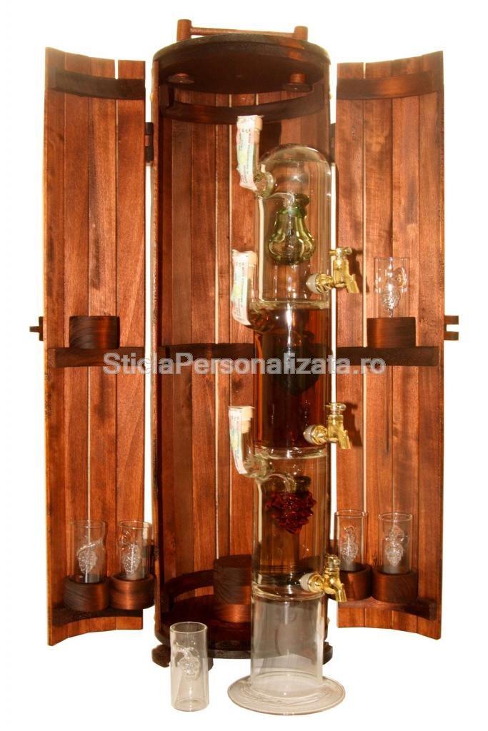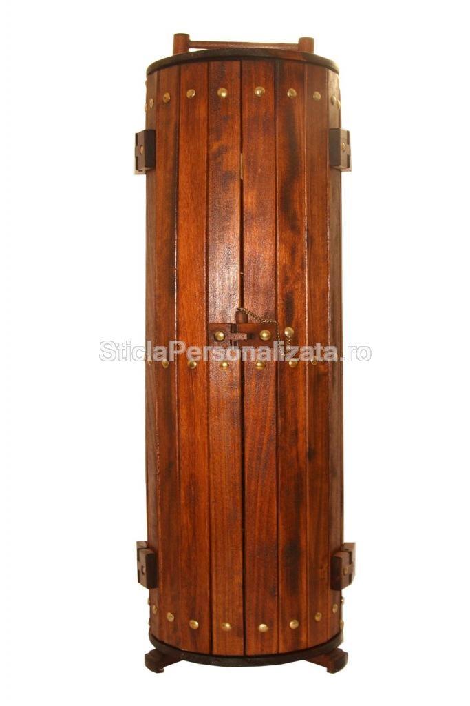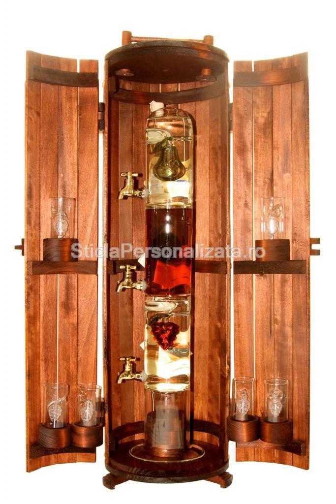 Cadoul perfect pentru evenimentele deosebite din viata dumneavoastra: barul mare cilindric din lemn, cu 2 canaturi. Sticla este prevazuta cu 3 recipiente in care puteti introduce 3 tipuri diferite de distilate din fructe, in functie de preferinte. Acestea sunt prevazute cu robineti pentru a turna cu usurinta bautura in pahare.