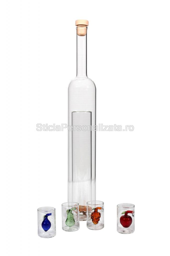 Cei mai buni parteneri pe scena distilatelor din fructe sunt sticla cilindrica si paharele pentru degustare, incluse in interiorul cilindrului. Pentru a va rasfata cu gustul bauturii preferate, va oferim un set alcatuit din 4 paharele cu detalii interioare in forma de fructe colorate.