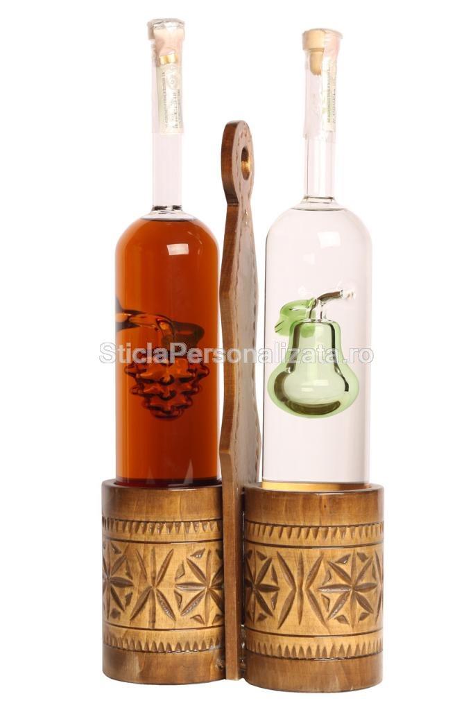 Unde-s doi puterea creste, iar veselia sporeste! Caucul dublu gazduieste doua sticle cilindrice, acestea fiind prevazute cu detaliu interior in forma de fruct. Suportul este decorat cu deosebite motive festive, aducand cinste folclorului traditional romanesc.