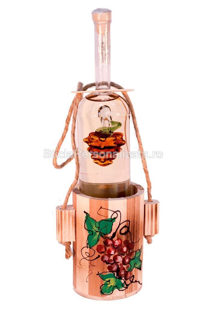 Sticla cilindrica prezentata intr-un cauc traditional reprezinta un suvenir ideal pentru turistii ce ne viziteaza meleagurile romanesti. Acest suport este decorat manual, avand o pictura ce intruchipeaza un strugure, simbolul vietii si al abundentei.