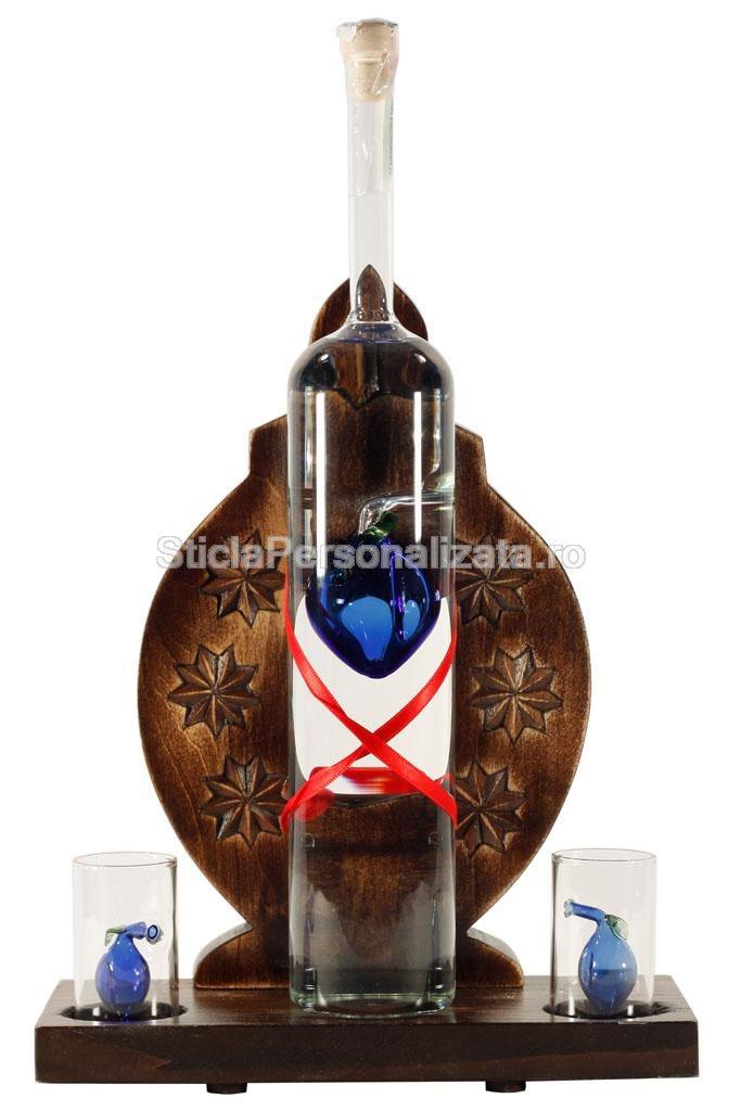 Plosca haiduceasca traditional romaneasca, incrustata cu motive florale, constituie un obiect decorativ reprezentativ pentru iubitorii folclorului autohton. Mai ales daca este insotita de sticla si paharele cu detalii interioare in forma de pruna.