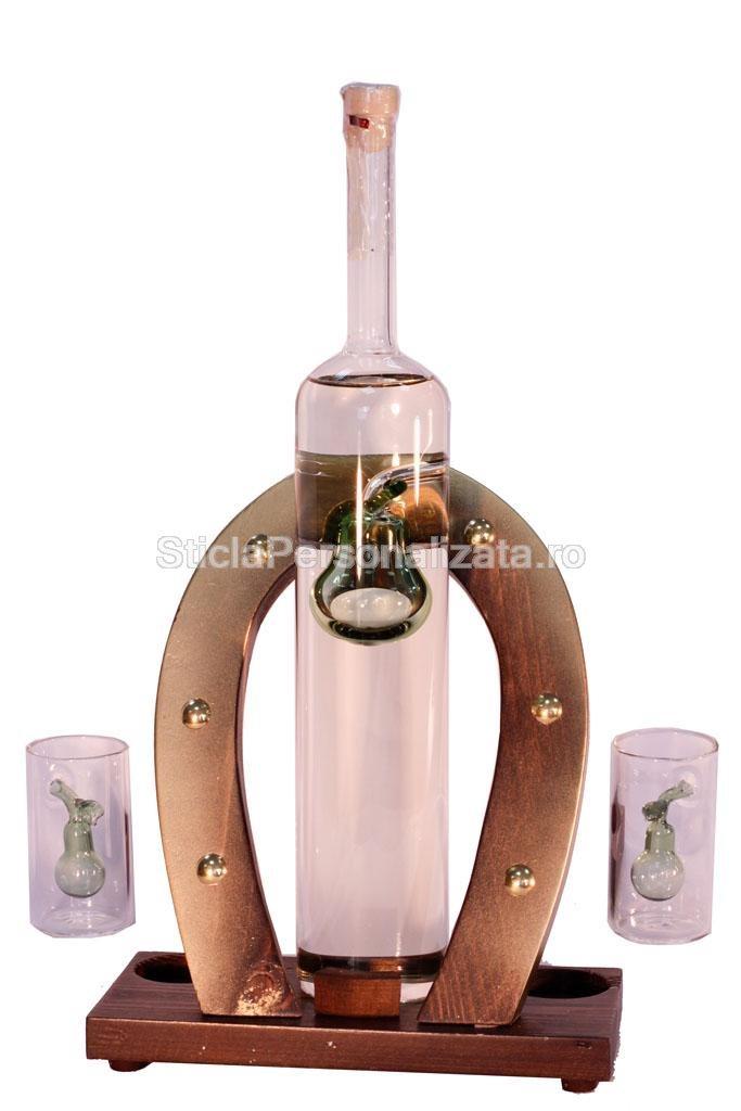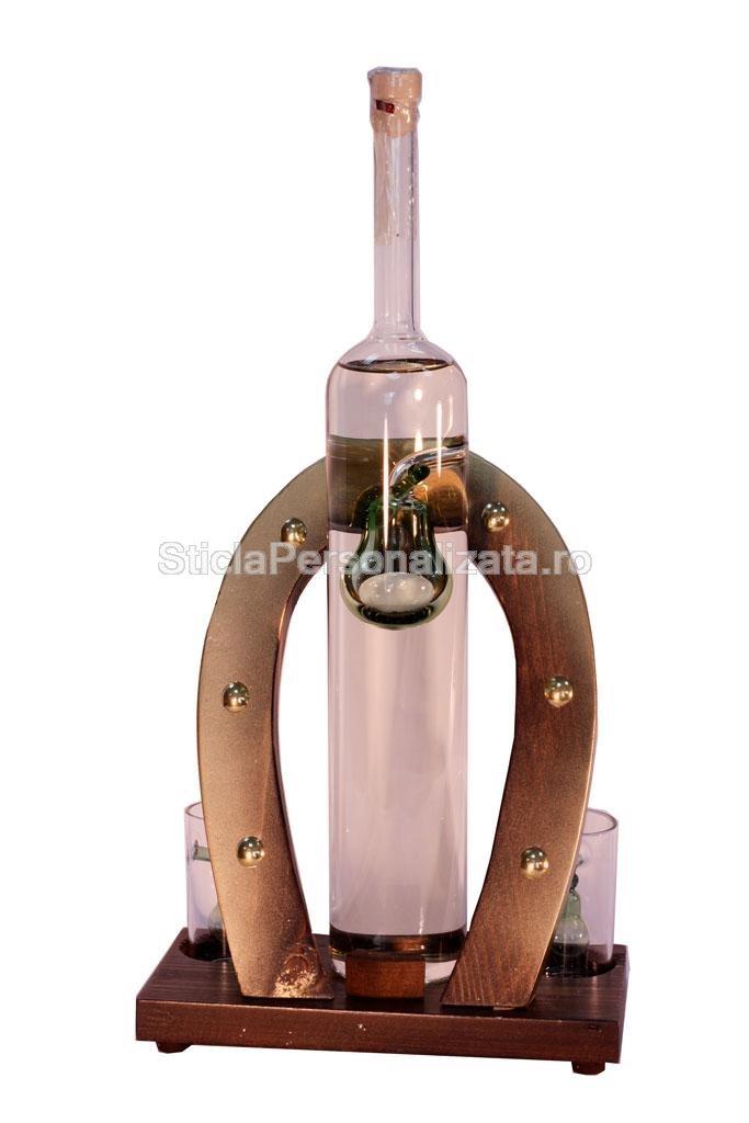 Potcoava reprezinta unul dintre cele mai cunoscute talismane aducatoare de noroc din lume. Pentru buna stare a caminului dumneavoastra, va oferim sticla cu suport in forma de potcoava. Setul este prevazut cu doua paharele pentru servirea bauturii. Atat sticla, cat si paharele, au in interior un detaliu in forma de para. De asemenea, si dopul sticlei este inclus in pret.